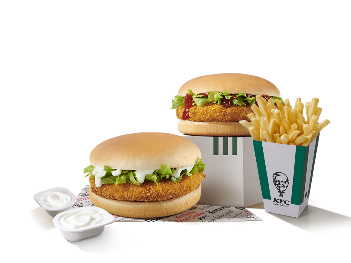 2 veg value burgers, crispy medium fries & 2 delicious dips at a deal price!