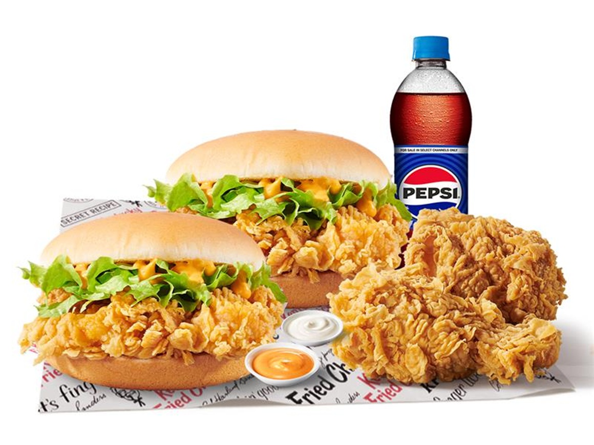 Deal combo of 2 chicken value burgers, 2 pc Hot & Crispy, 2 dips & a chilled Pepsi PET