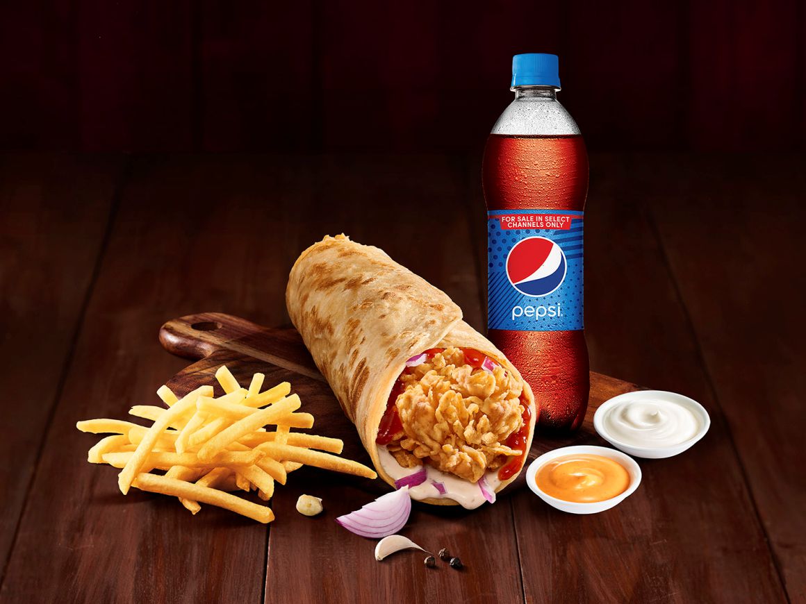 Deal combo of 1 New Double Chicken Roll, Large Fries, 2 Dips & 1 Pepsi PET [serves 1]
